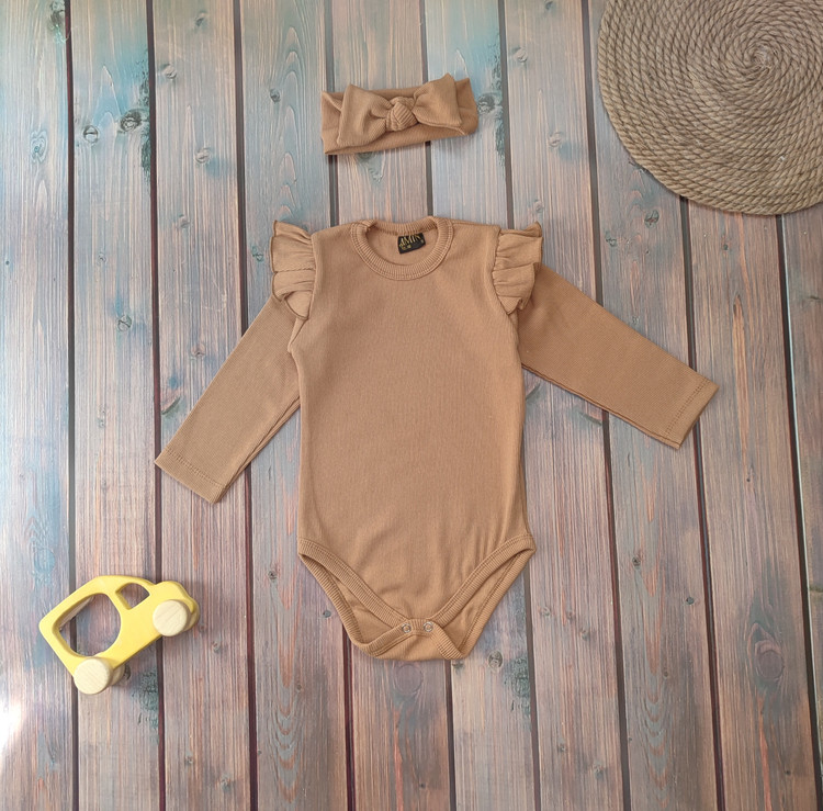 یک بادی نرم و راحت با کشسانی عالی که به راحتی به بدن کودک شما فرم میدهد. رنگ نسکافهای آرامشبخش و شیک برای هر فصلی، همراه با هدبند گرهای ست که به زیبایی تکمیلش میکند. 🌟